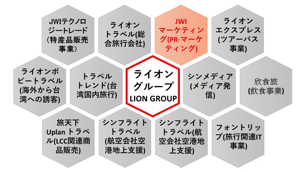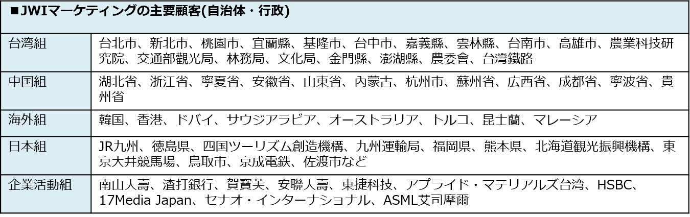 その中でも2009年に設立した「JWIマーケティング(傑森整合全球行銷 / JWI Marketing)」は、台湾における世界各地の観光宣伝、広告戦略、イベントの企画など、主に観光に関するPR支援事業を展開し、従業員数は120名、国際チーム、日本チーム、台湾チーム、企業イベントチーム等のチーム毎に分かれて活動しています。2016年~2021年までの平均売上は1.8億元(日本円で約10億円)、海外向けには日本、韓国、マレーシア、ドバイ、ベトナム、中国等、世界各国を対象にサービスを提供しており、台湾国内向けには各自治体に対してより多くの送客につながるためのサービスの提供や、台湾の各自治体を世界にPRする為のサービスを提供しております。自治体の宣伝に関する観光コンサルティング業務やイベント企画など、弊社には豊富な実績がございます。
